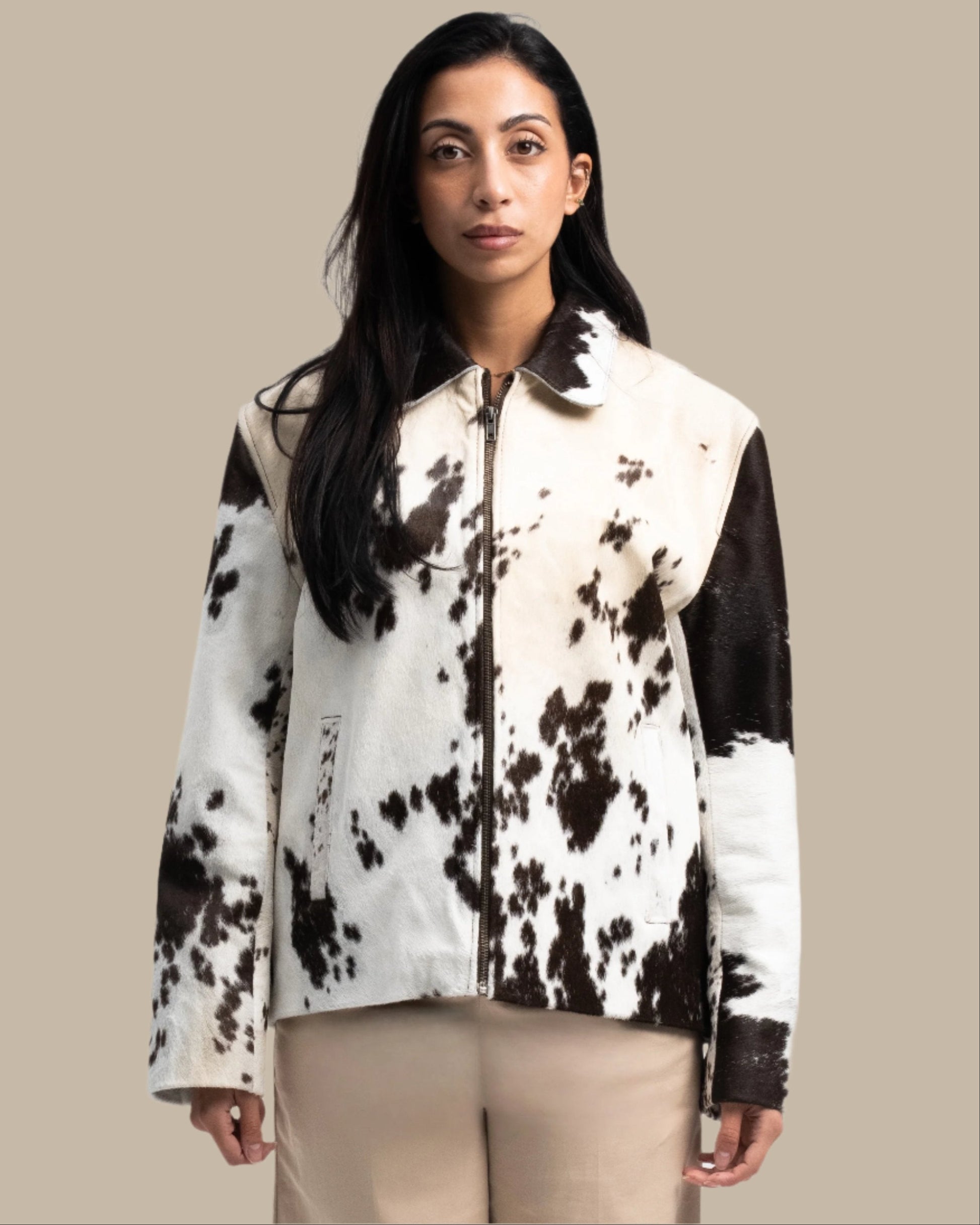Small oversized straight-fit jacket made entirely from natural cowhide, featuring a one-of-a-kind distinctive pattern. Each piece is a unique statement, emphasizing the raw beauty of hide.